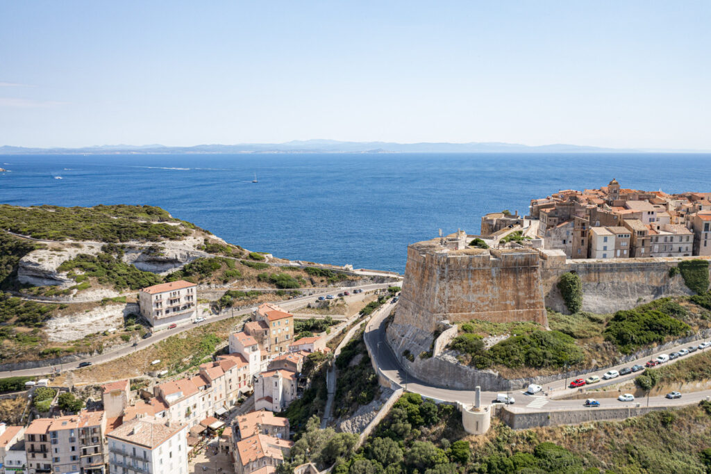 Cité en apesanteur battue par les vents, Bonifacio est une gageure, une ville triomphante dressée telle une déesse à 70 mètres au-dessus des flots, au faîte de falaises de calcaire vertigineuses.